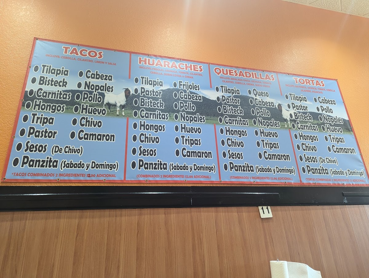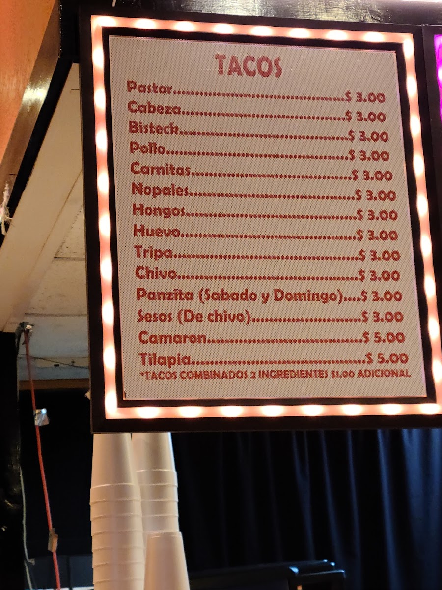 This menu caters to customers looking for quick and casual dining, with many items priced for individual servings such as tacos, making it suitable for light meals or a full lunch. The variety of traditional dishes allows for a diverse selection depending on appetite and preference.
