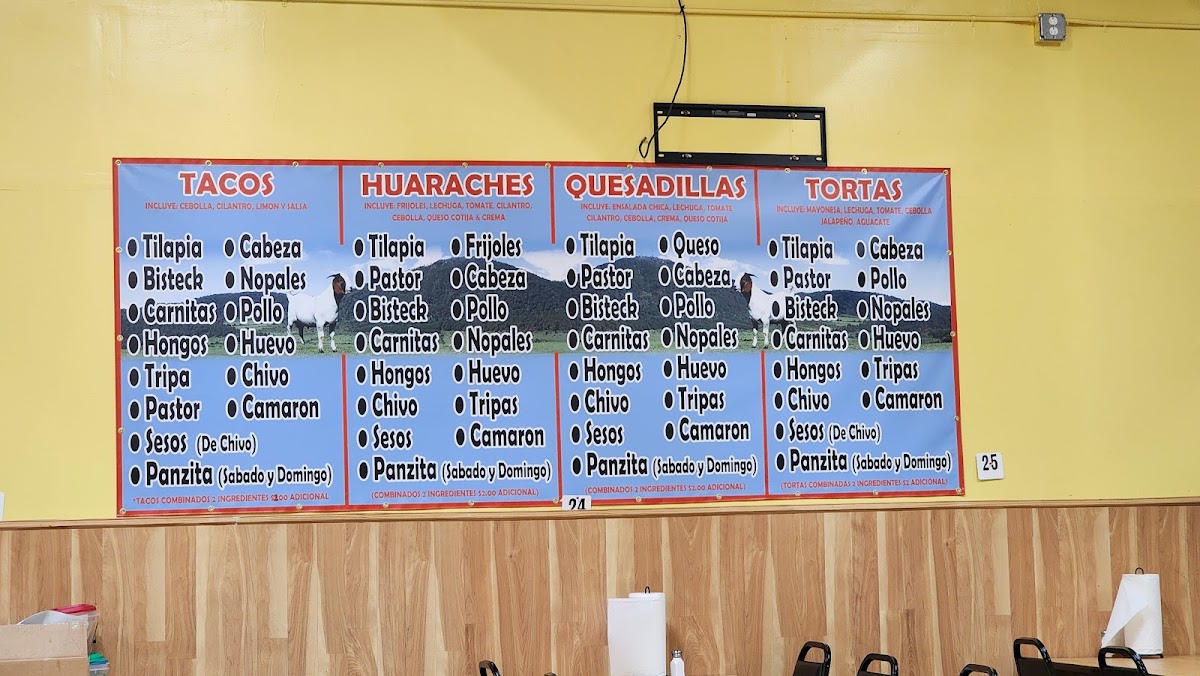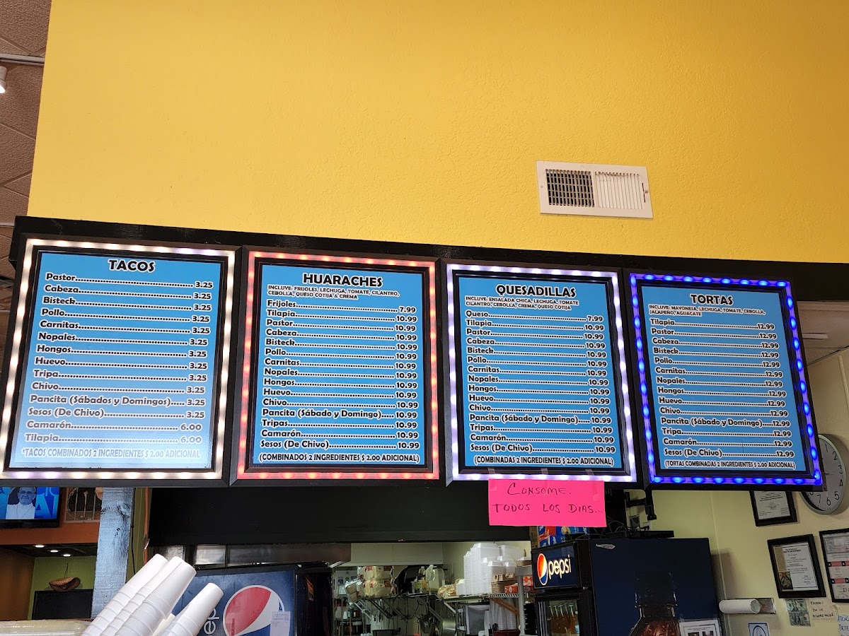 The menu at Taqueria La Candelaria features a variety of traditional Mexican dishes with a focus on tacos and other regional specialties. The offerings are organized into several main categories, including huaraches, tortas, alambres, and a selection of tacos and quesadillas.