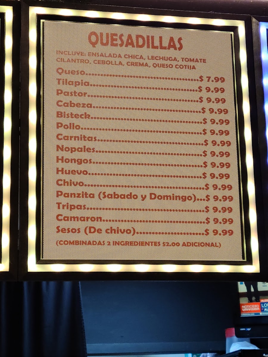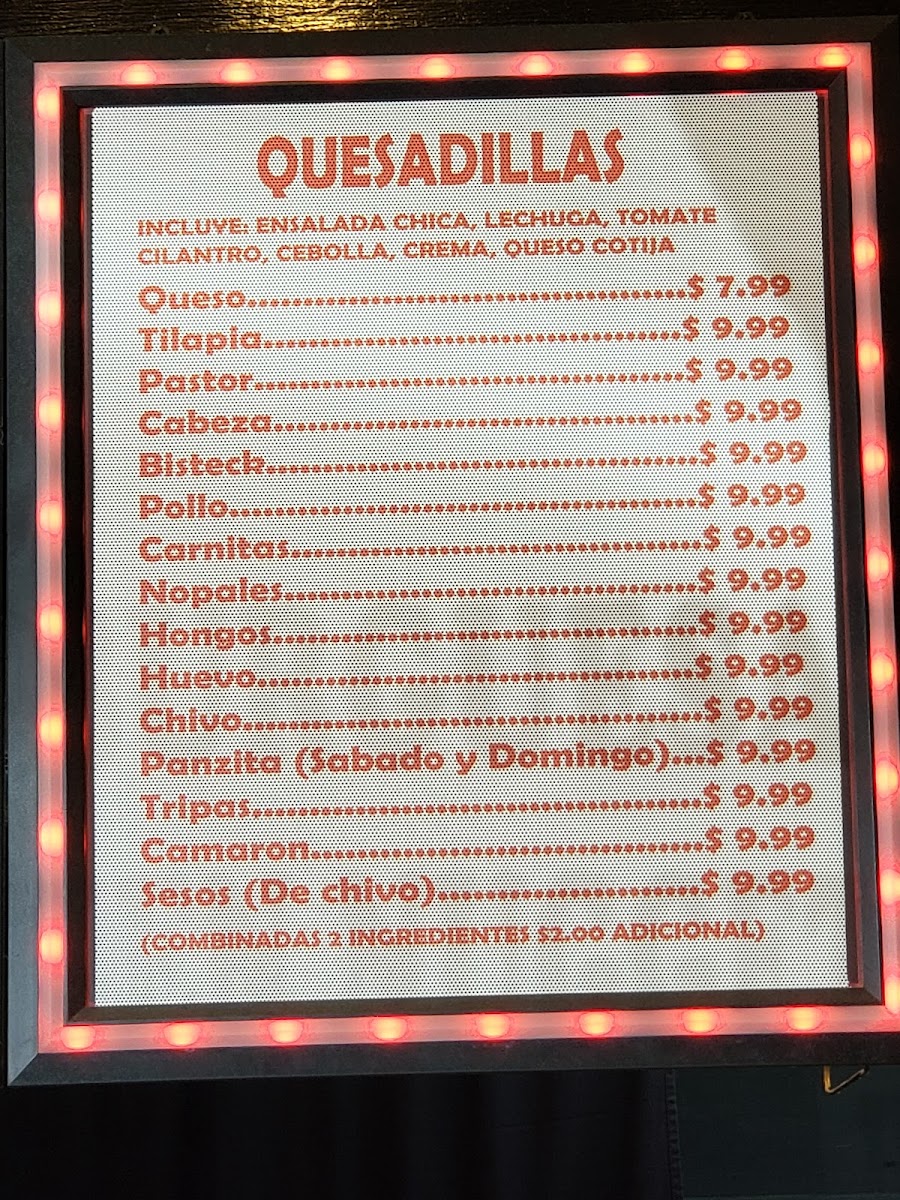 Other menu highlights include tacos with fillings such as tripa, sesos, camaron, nopales, and bistek, accompanied by traditional accompaniments like consomé and salsas including red salsa, guacamole, green chile, radish, onion, and cilantro. Quesadillas available here include varieties with shrimp, tilapia, and mushrooms, as well as grilled options served with salad.