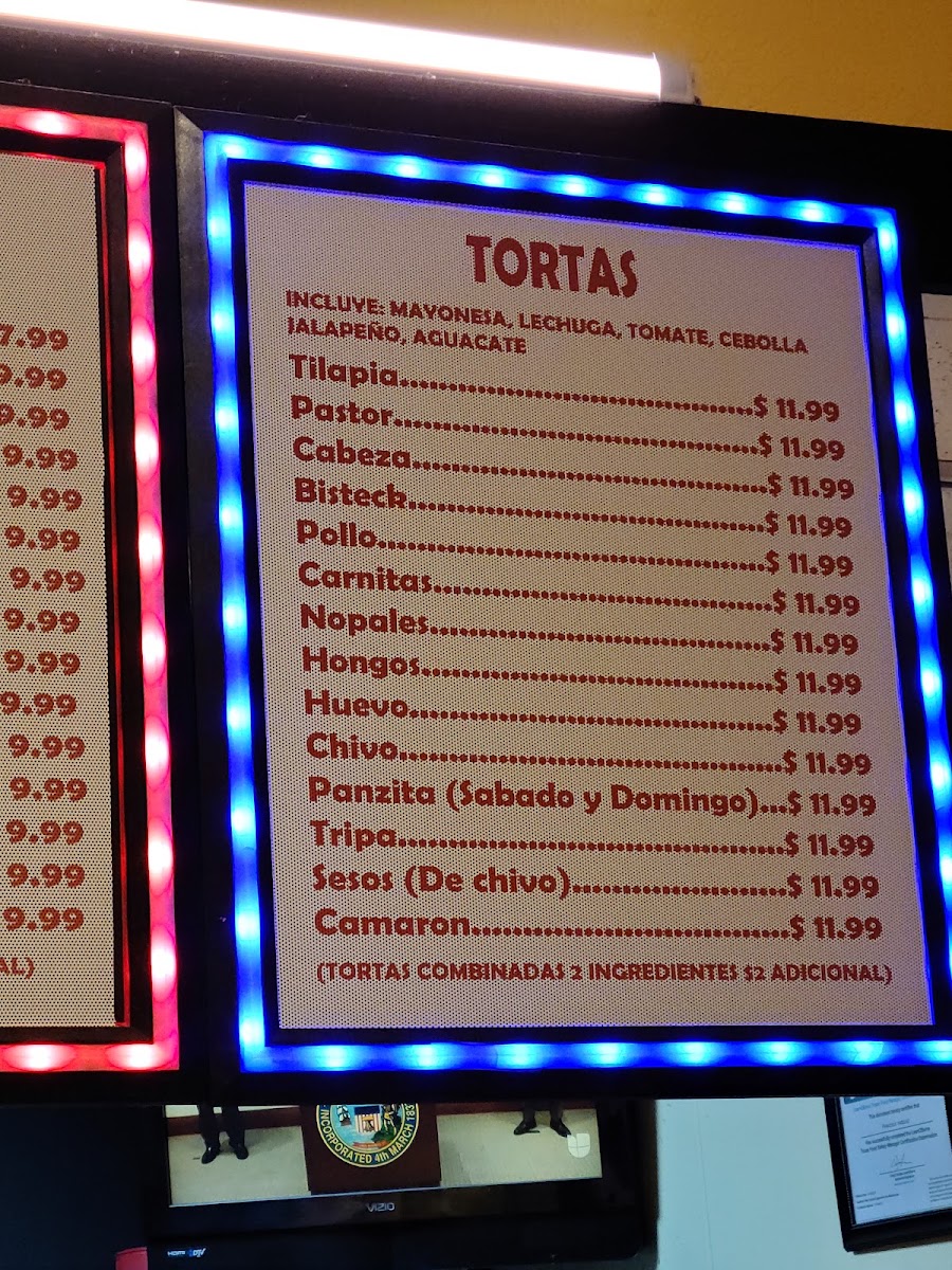 Tortas are Mexican-style sandwiches filled with various meats and vegetables including tilapia, pastor, cabeza, bisteck, pollo, carnitas, nopales, hongos, huevo, chivo, tripa, and sesos de chivo. They offer a convenient choice for a more substantial meal.